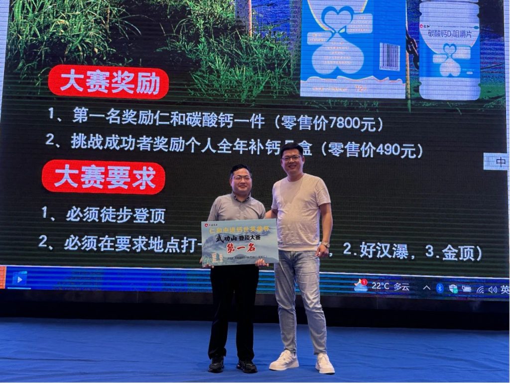 在登頂武功山環(huán)節(jié)中,增添了《鈣世英雄》登山比賽,為客戶(hù)朋友們添上了登山彩頭。參與者們需徒步上山,而每一位完成比賽的人都將獲得本人全年所需的補(bǔ)鈣鈣片作為獎(jiǎng)勵(lì)。其中,表現(xiàn)最為卓越、奪得第一名的選手,更是能夠榮獲一整箱碳酸鈣D3咀嚼片的殊榮。經(jīng)過(guò)精彩激烈的角逐,來(lái)自河南省鄭州市地區(qū)的范鐵軍先生斬獲頭籌!