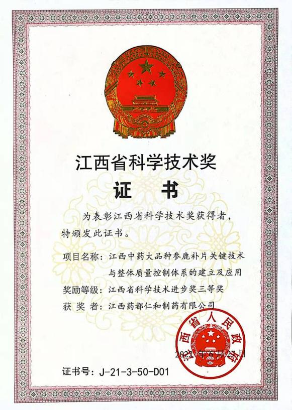 2022年6月27日,江西省人民政府網站公告了《關于2021年度江西省科學技術獎勵的決定》(贛府字〔2022〕37號)正式文件,由江西藥都仁和制藥有限公司牽頭申報的“江西中藥大品種參鹿補片關鍵技術與整體質量控制體系的建立及應用”榮獲江西省科學技術進步獎三等獎。? ? ? ? 江西省科學技術進步獎是江西省人民政府為獎勵在推動江西省科學技術進步中做出重要貢獻的集體和個人、充分調動和發揮廣大科技人員的積極性和創造性、加速社會主義現代化建設發布的獎項。 該獎項先后通過了項目形式審查、外省專家網絡評審、專家現場答辯、公示等評審程序,最終獲得了江西省人民政府批準的江西省科學技術進步獎三等獎。? ? ? ? “江西中藥大品種參鹿補片關鍵技術與整體質量控制體系的建立及應用”項目由江西藥都仁和制藥有限公司為牽頭單位、聯合江西省藥品檢驗檢測研究院,在以黃武軍教授級高工為負責人的技術攻關團隊歷經五年多的努力,共同取得的重大科技成果。 項目以江西中藥大品種—參鹿補片為研究對象,進行了提取、濃縮、薄膜包衣等系列的工藝技術創新,建立了包括原藥材、中間體、藥包材、成品的全過程質量控制技術方法與標準,實現了全過程的精準控制,提高了產品質量;建立了自動化、智能化生產線,實現了產業化,提升了產品品質及產能。研制過程中獲得了參鹿補片(薄膜衣片)補充申請批件、國內發明專利證書1項、江西省新產品證書1項,江西省優秀新產品獎二等獎1項,發表學術論文2篇。? ? ??? ? ? ? 仁和?參鹿補片在品牌打造上,一直圍繞著多角度、多方向的品牌傳播方式,通過高鐵冠名,央視:CCTV2、4、7、8、10、12套,地方衛視:安徽、浙江、深圳、江西電視臺廣告投放;四大醫藥類門戶網站:39健康網、快速問醫生、尋醫問藥網,名醫在線等專題建設,各類新興媒體平臺推廣;以創新的視角為仁和品牌打造具有社會廣泛影響力的傳播,快速提升仁和?參鹿補片知名度。