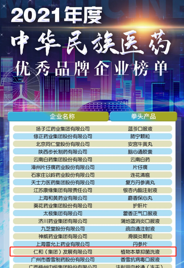 仁和連續6年入選中華民族醫藥優秀品牌企業榜單