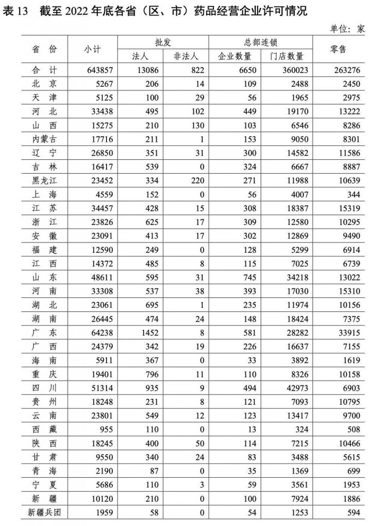 最新!全國藥店總數(shù)達(dá)62.3萬家 發(fā)布時(shí)間: 2023年04月21日 09:59:40 閱讀量: 4月19日,國家藥品監(jiān)督管理局發(fā)布了《藥品監(jiān)督管理統(tǒng)計(jì)年度數(shù)據(jù)(2022年)》(下稱《年報(bào)》),對2022年全國藥品經(jīng)營行業(yè)的發(fā)展?fàn)顩r進(jìn)行了詳細(xì)的統(tǒng)計(jì)和分析。 《年報(bào)》顯示,截至2022年底,全國共有《藥品經(jīng)營許可證》持證企業(yè)約64.4萬家,其中批發(fā)企業(yè)約1.4萬家;零售連鎖企業(yè)6650家,對比同期的6596家,增長54家。與2021年披露的數(shù)據(jù)相比,各類藥品經(jīng)營企業(yè)數(shù)量均有所增加。 全國門店總數(shù)突破62.3萬家。其中,零售連鎖企業(yè)門店約36.0萬家,對比同期的33.7萬家,增幅6.8%;單體藥店由上年的25.2萬家增至26.3萬家,增幅4.3%。 從區(qū)域數(shù)量上看,廣東、四川、山東的藥店數(shù)最多,分別為62197家、49876家、47240家。連鎖率方面,上海、四川最高,上海為91.9%,四川為86.2%。 由于連鎖企業(yè)門店增幅超過單體藥店增幅,致全國藥店的連鎖率由上年的57.2%提升至57.8%,增加0.6%。藥品零售行業(yè)呈現(xiàn)數(shù)量增長、規(guī)模擴(kuò)大、連鎖率提高的特點(diǎn)。 《年報(bào)》還對執(zhí)業(yè)藥師的注冊情況進(jìn)行了統(tǒng)計(jì),截至2022年底,全國共有執(zhí)業(yè)藥師709548人。其中藥品零售企業(yè)注冊的人數(shù)最多,約645021人。藥品生產(chǎn)企業(yè)的注冊人數(shù)為4883人,藥品批發(fā)企業(yè)的注冊人數(shù)約為40399人,醫(yī)療機(jī)構(gòu)的注冊人數(shù)為19110人,其他135人。(轉(zhuǎn)自第一藥店財(cái)智) 下一篇:被官方點(diǎn)名!網(wǎng)售藥品,更嚴(yán)了上一篇:5月1日實(shí)施!不得利用互聯(lián)網(wǎng)發(fā)布處方藥廣告!